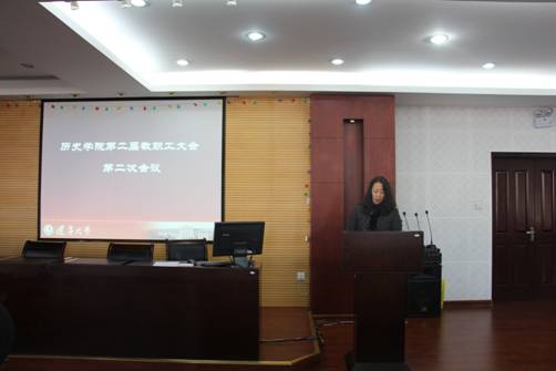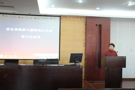 2016年12月28日,历史学院会议室洋溢着庄严而热烈的气氛,学院第二届教职工大会第二次会议胜利召开。大会上,全体教工听取了学院工作报告、工会工作报告、提案汇总情况报告。之后分组讨论,就两个报告及学院的工作展开讨论。复会后教工以举手表决的方式通过两个报告。最后学院总支书记做大会发言。